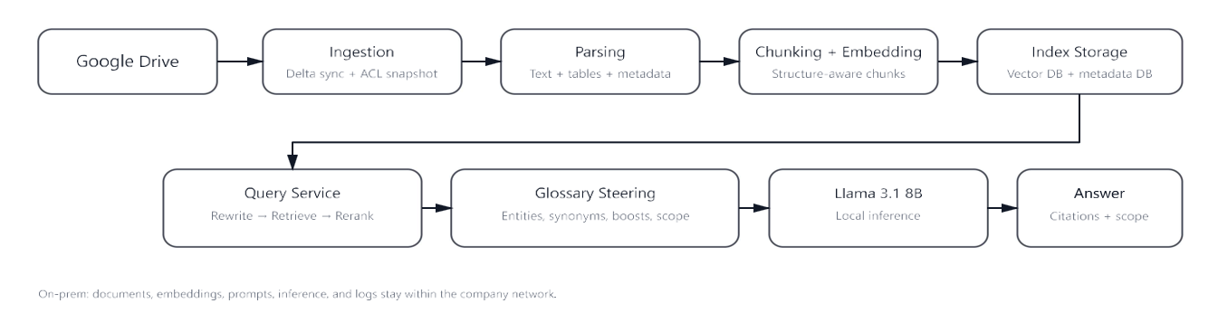 Figure 1. End-to-end architecture: ingestion → indexing → retrieval → glossary steering → local LLM → cited answers.