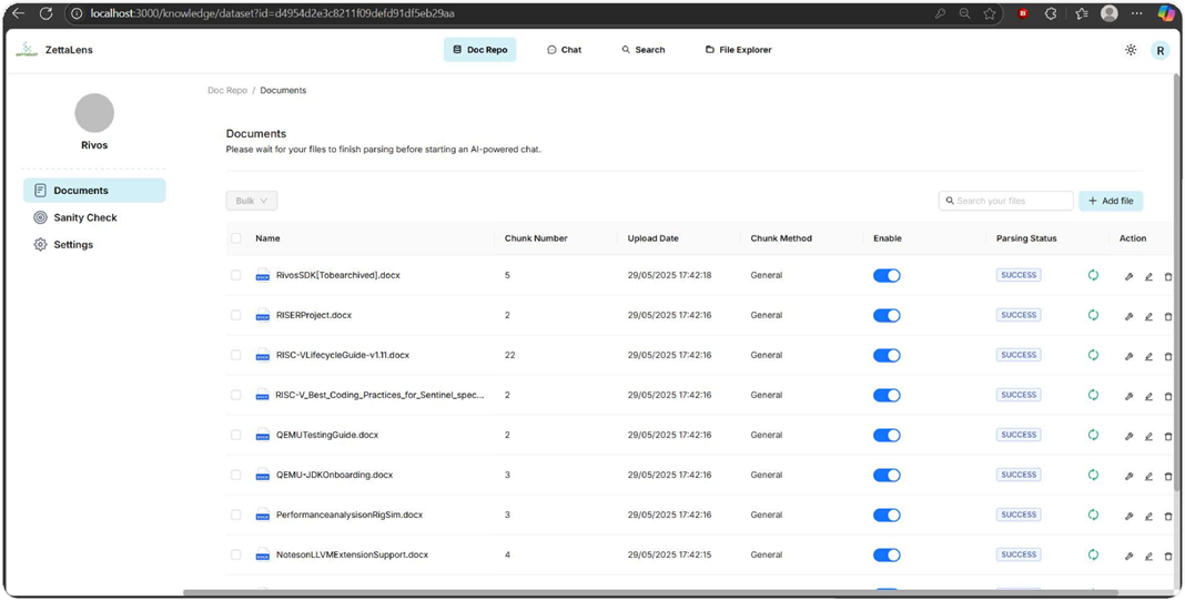 Figure 3. Knowledge base document repository with parsing status and controls.