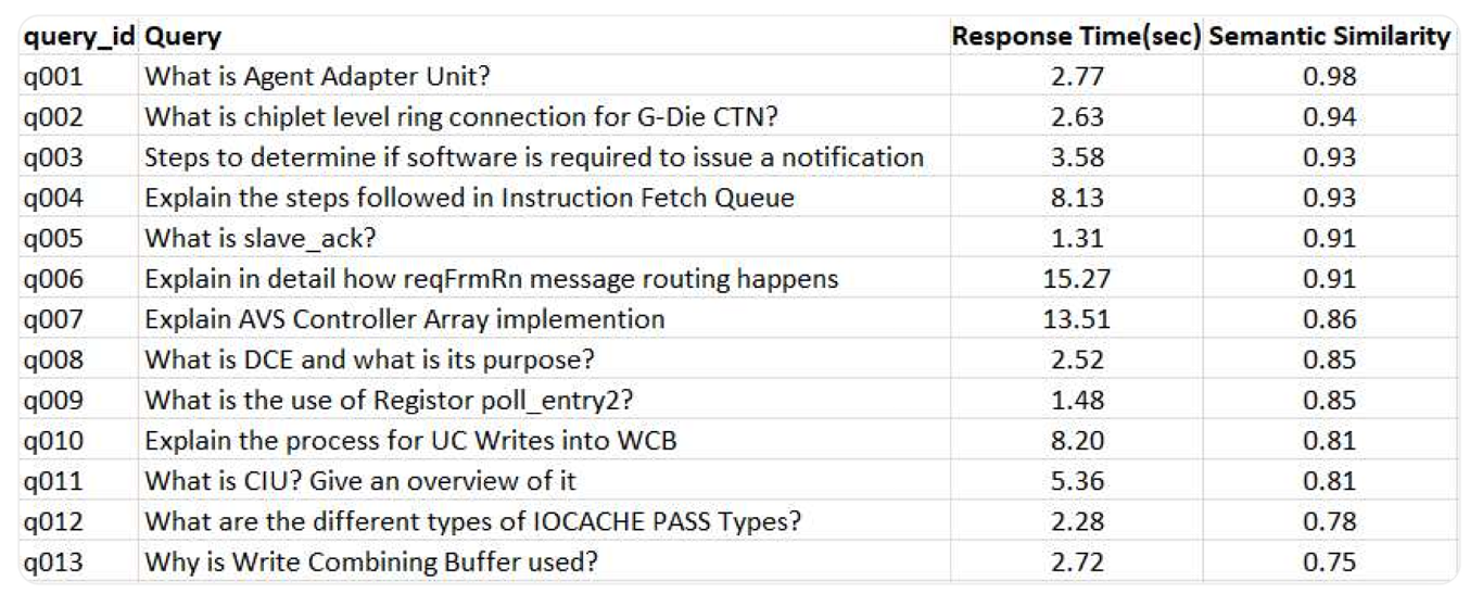 The single biggest relevance lever is domain grounding. A curated glossary is used as an active component of the pipeline: it disambiguates overloaded terms (e.g., Vmin, corner, training), expands internal aliases and synonyms, and injects retrieval hints so the model sees the right context before generating an answer.