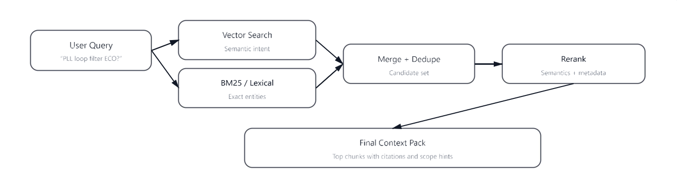 Semiconductor corpora are acronym-dense and entity-heavy (register names, IP blocks, stepping labels, test modes). Pure vector retrieval can miss exact identifiers; pure lexical retrieval can miss semantic intent. A hybrid approach combines vector similarity with keyword/BM25 style retrieval, merges candidates, and applies reranking based on semantic relevance and metadata (doc type, authority, revision, and scope).