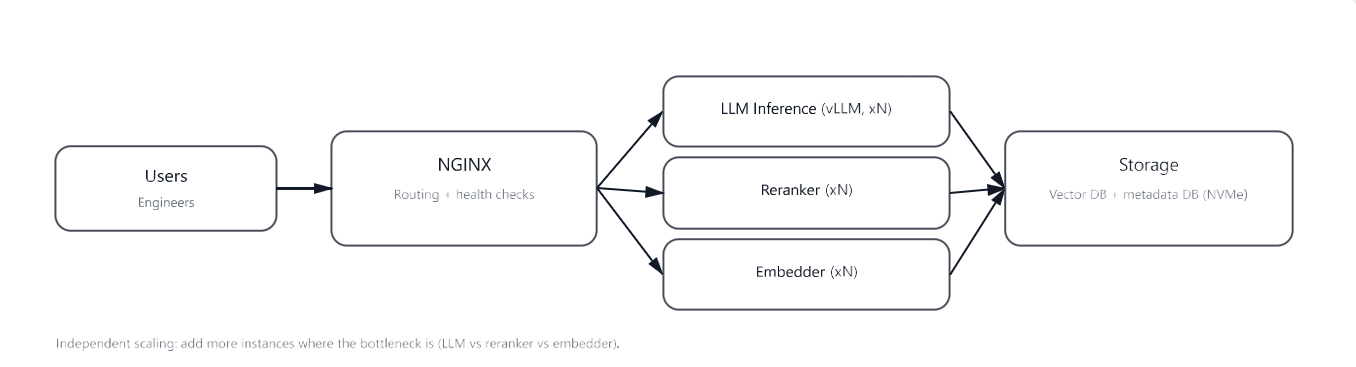To support multiple engineers concurrently, the recommended deployment pattern runs multiple instances of the LLM, reranker, and embedder, fronted by NGINX for load balancing. This isolates heavy inference workloads, improves tail latency, and enables incremental horizontal scaling.
